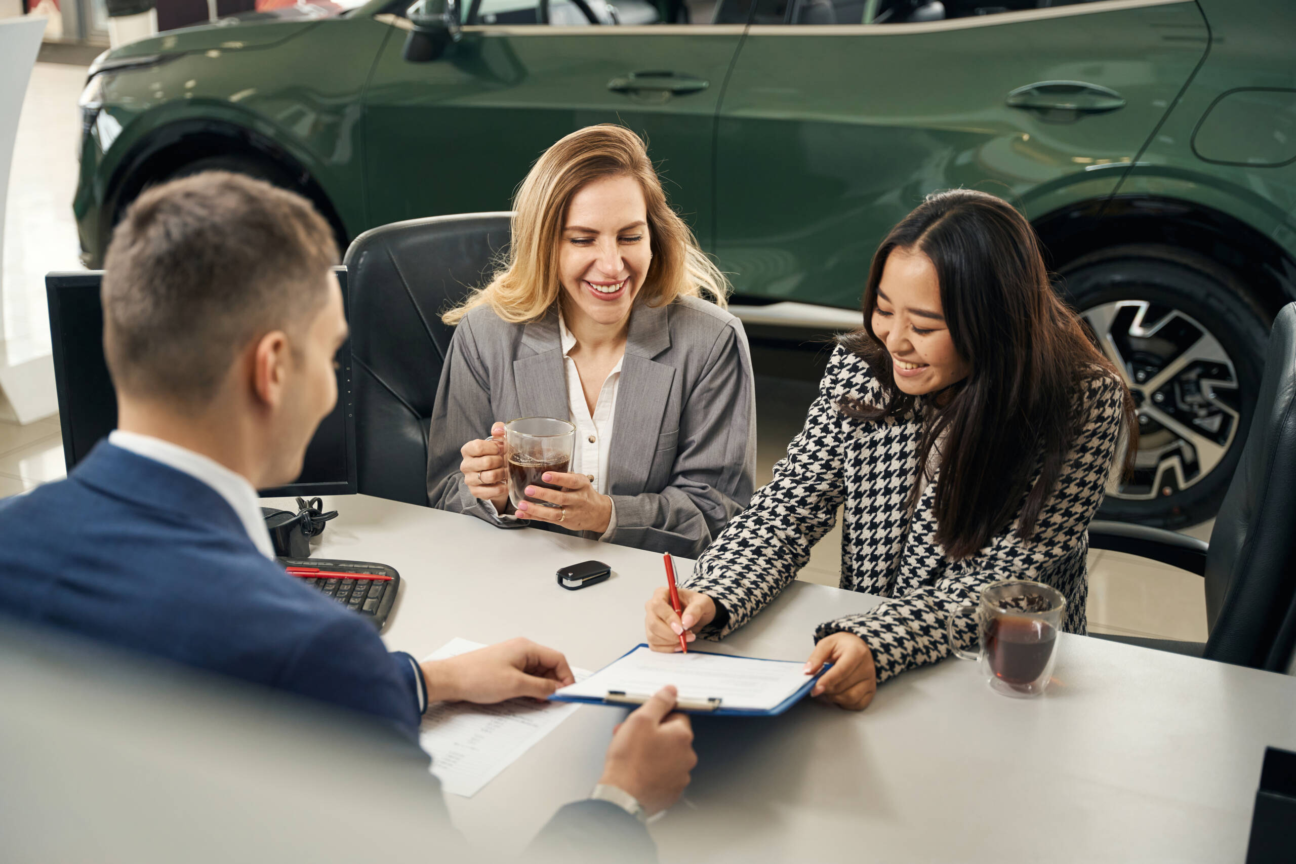 Charming asian woman signs a contract for the purchase of a car, her friend and a car dealership manager are nearby